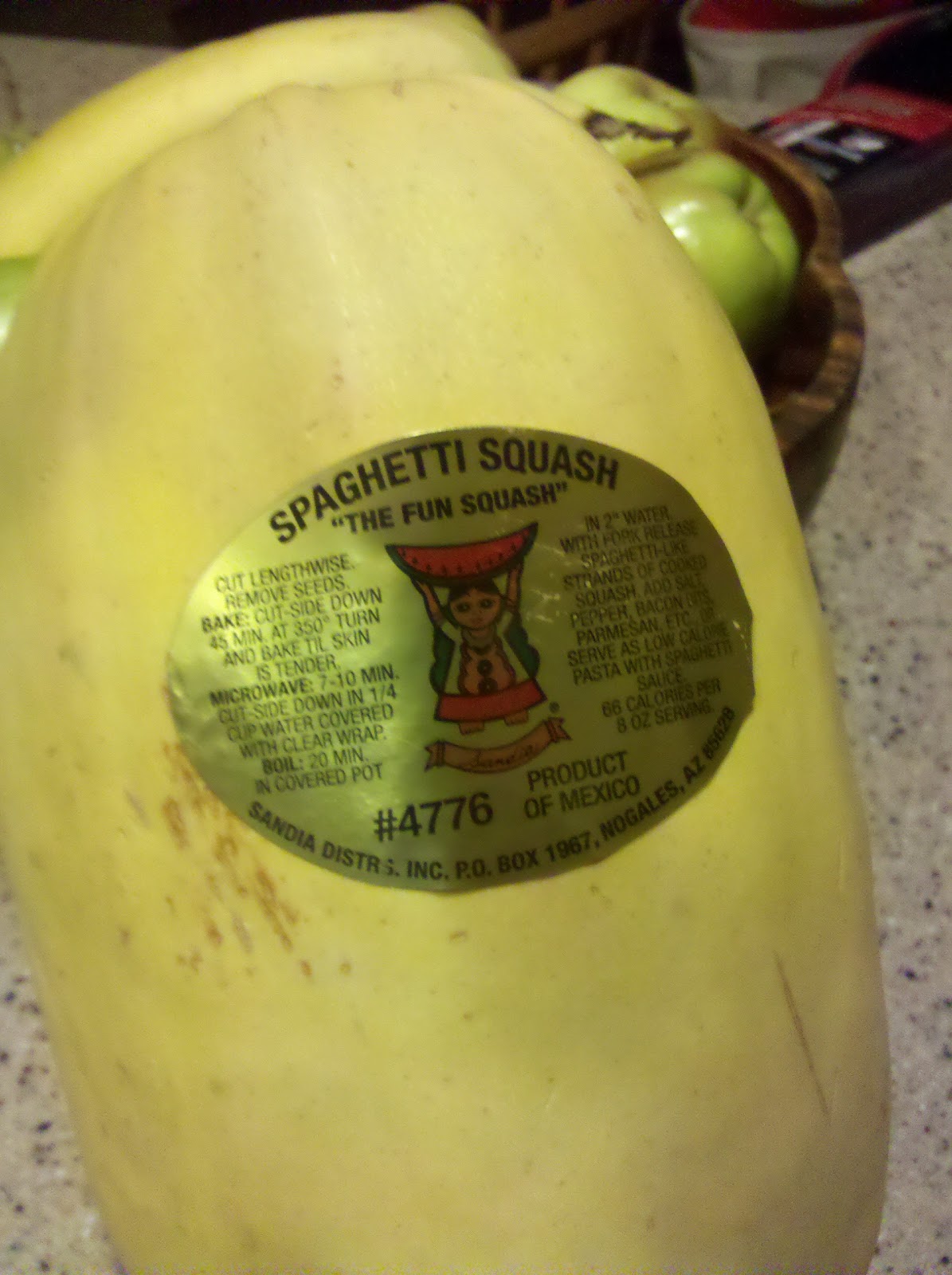I gave this guy a chance since it came in our Bountiful Basket... I must say, it's pretty amazing! Slicing ours in half length wise was a bit of a chore - I thought for sure Josh was going to slice a finger off, but he's pretty careful. I scooped out the seeds and popped it in the oven. I was surprised how easy it was to scoop out the guts and it just came out in perfect spaghetti strands.